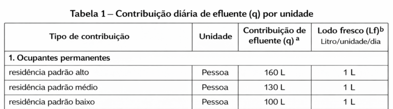 A norma fornece valores de contribuição diária de efluente (L/unidade/dia) na sua Tabela 1.